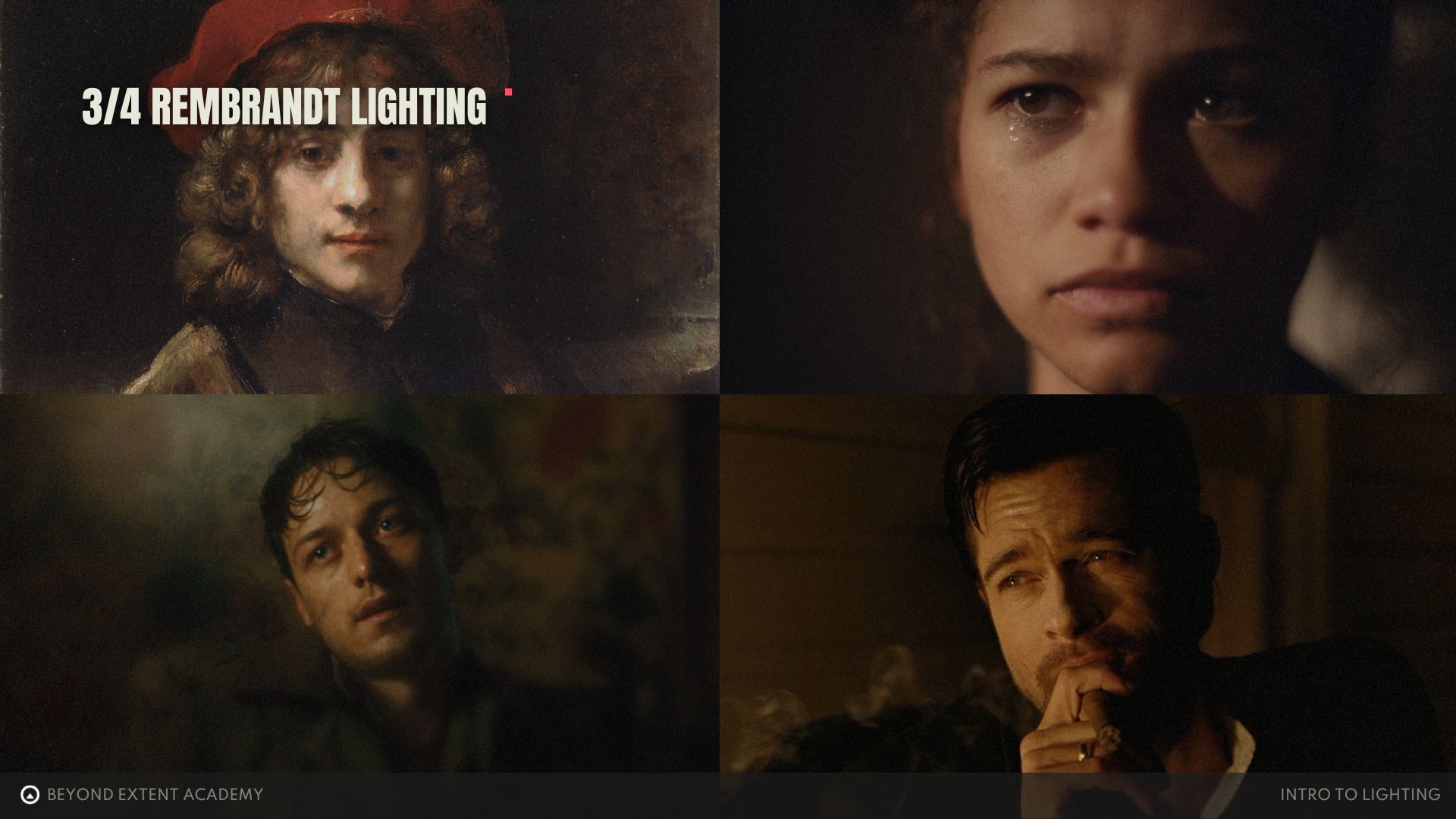 Originating from painter Rembrandt Harmenszoon van Rijn, this style uses a triangle of light on the shadowed side of the face to add depth and define facial features. This approach created a pleasing gradient of light and shadow, emphasizing the natural features and depth of the subjectâs face. When you start analyzing frames from various films, youâll notice this technique being used time and time again.
