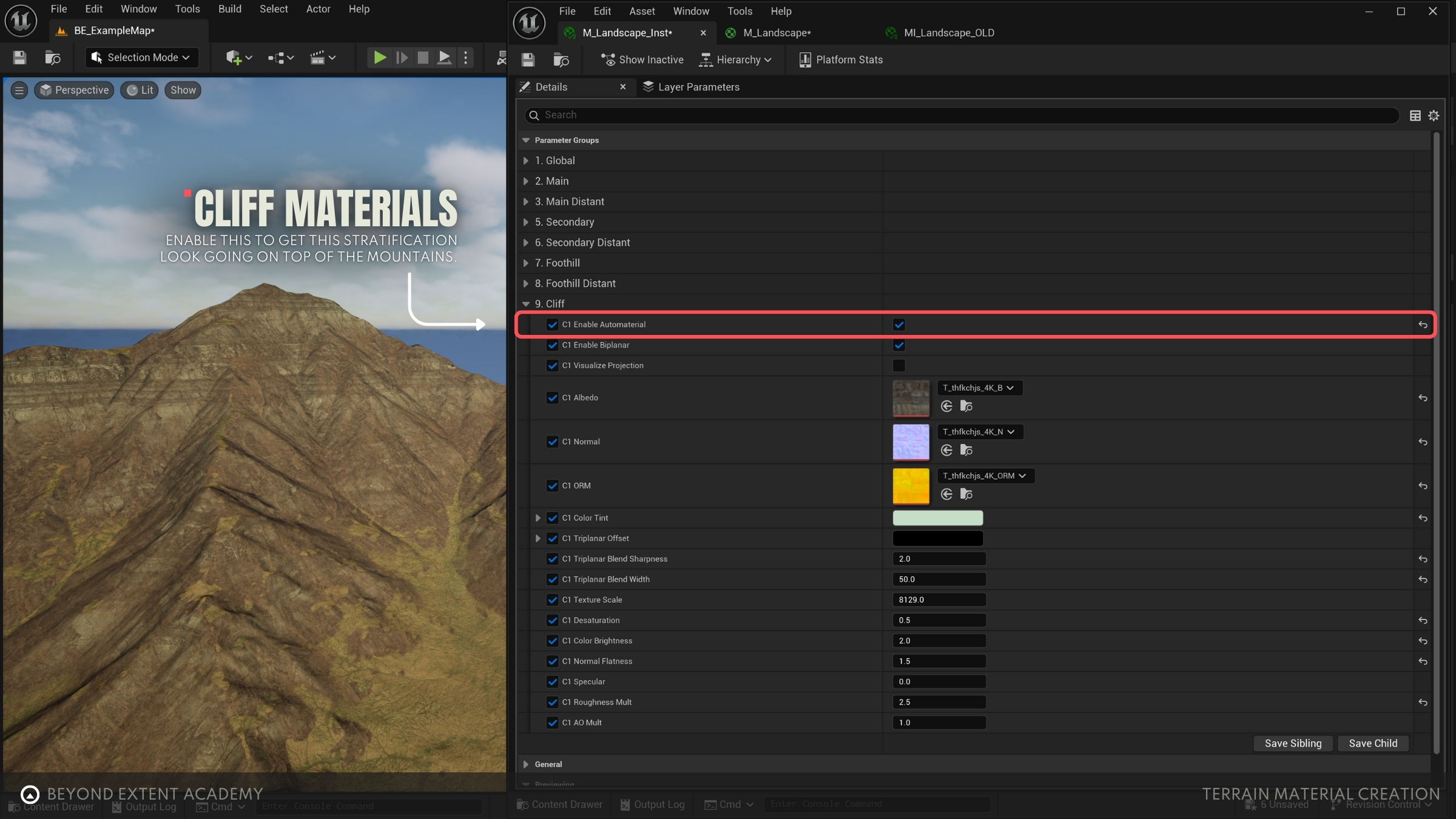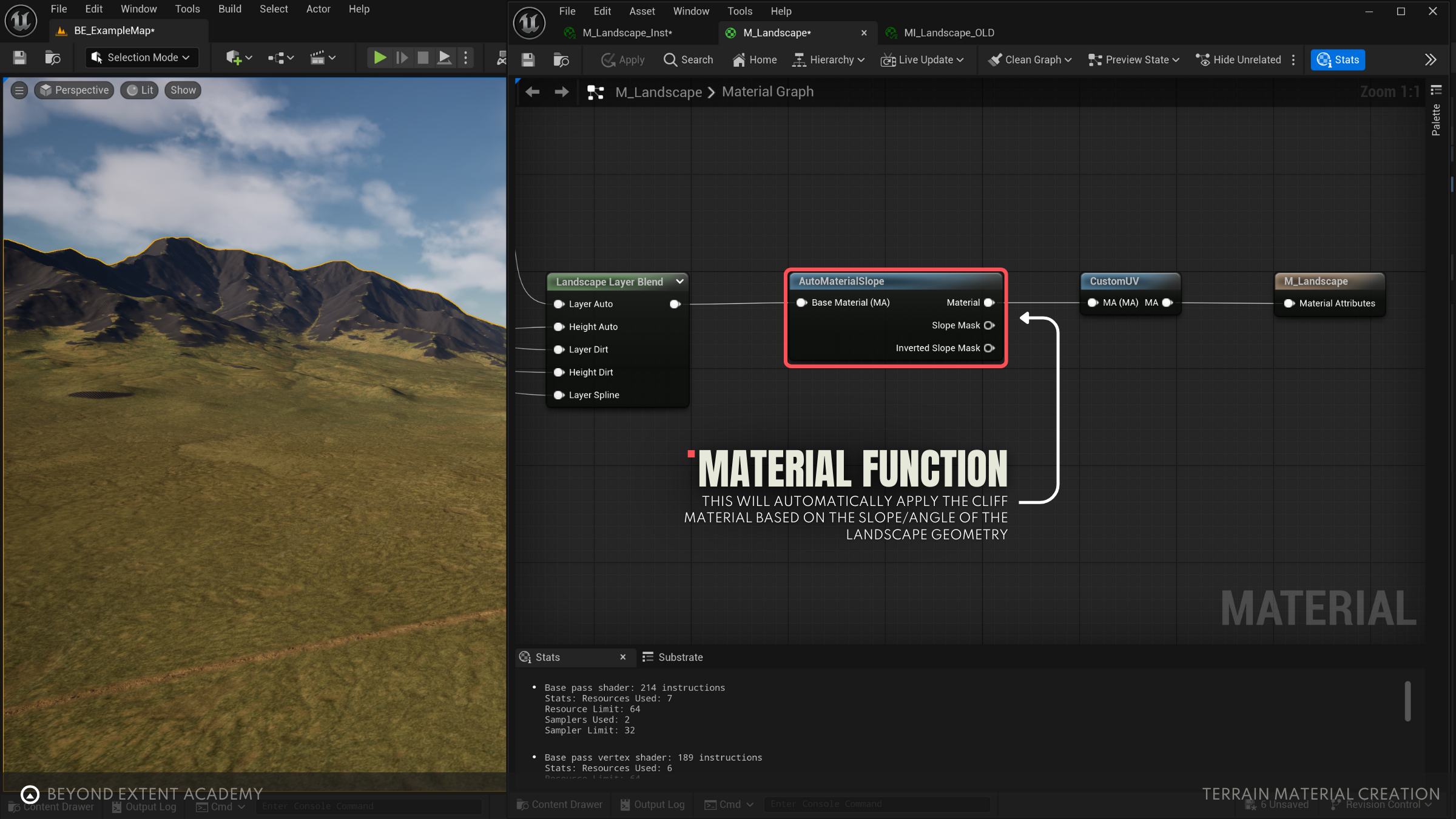 Here we will be using the main AutoMaterialSlope material function to add foothills and cliffs to our landscape material. We'll cover how to adjust our slope detection as well as our triplanar projections to finally bring all the elements of our landscape together.