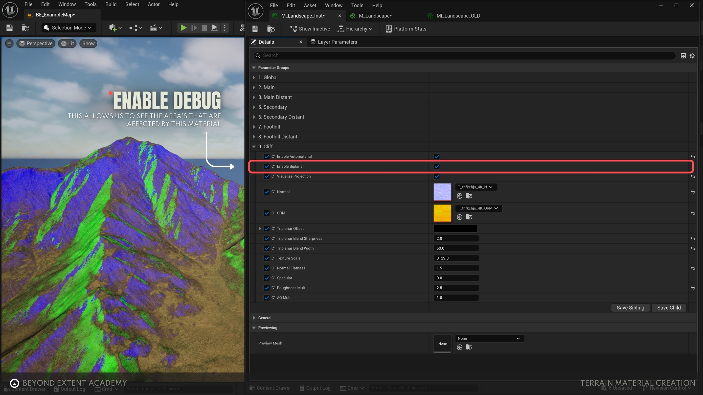 This final cliff material uses texture projection from multiple directions. To get a better look at how it's being applied, turn on the ‘C1 Visualize Projection’ toggle—this gives you a visual breakdown of how the material blends across surfaces.