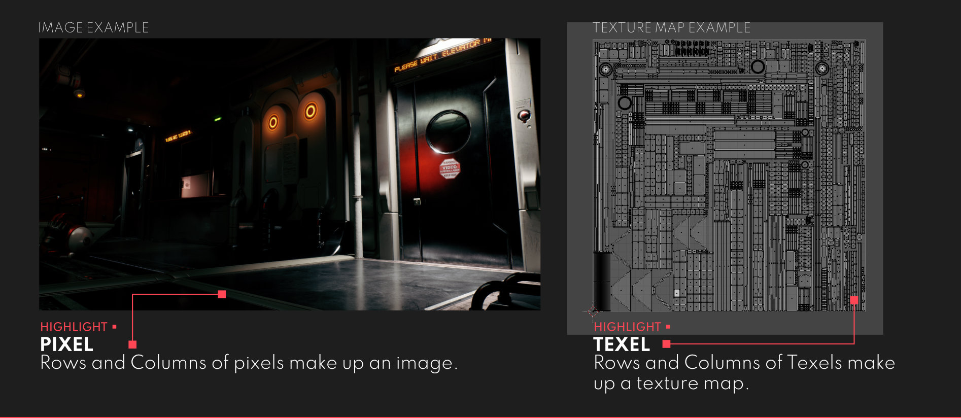 A GPU (Your Graphics Card in your PC) takes these texels and projects them onto the pixels on your screen through texture mapping (This is why we have UV’s)